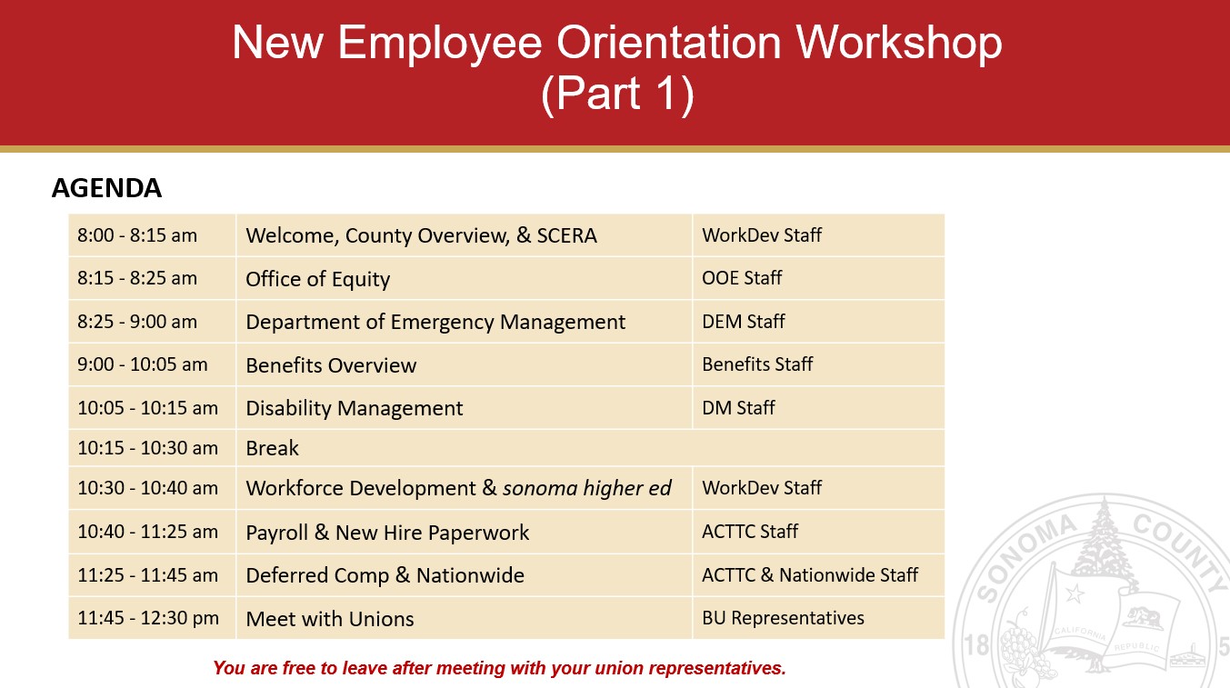 All new employees attend a Workforce Development hosted NEW EMPLOYEE ORIENTATION on or around their first day. In addition, members of the HR Benefits, Payroll and Deferred Comp teams are present as well as the applicable Union representatives. New employees are also enrolled in a series of web-based trainings as part of NEO through sonoma higher ed, the County's learning management system (LMS). These focus on County Critical Topics: